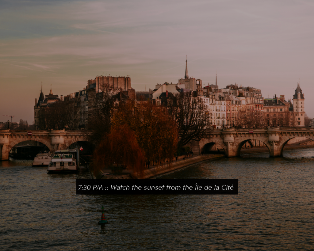 Position yourself on the Pont Neuf or along the quai just as the light starts to go golden. The Seine turns colors you don’t have words for in English. Notre-Dame’s spire — rebuilt now, returned to the skyline after the 2019 fire — rises to the east. The bateaux mouches drift past.